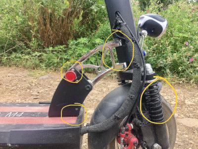 С одними можно бороться, с другими нет, как например люфт передних амортизаторов. Но самое печальное это люфт в месте соединения с декой. Больше всего его заметно если дергать рулевую у лежащего на боку скутера. Причина пока неизвестна но думаю место опасное и надо думать над усилением.