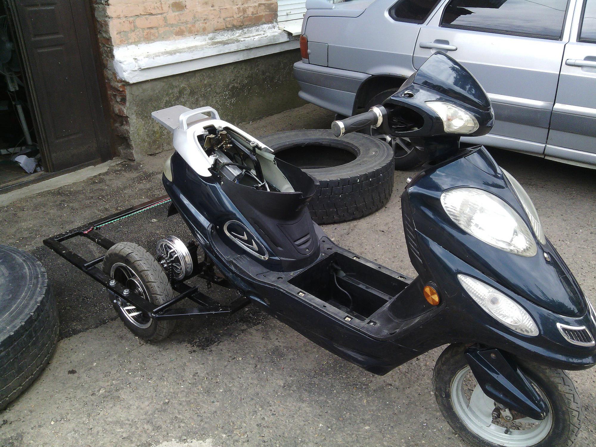 чуть позже собрал "ДеДский" (от слова дедушка) трехколесный электроскутер на 350вт колесах с цепной передачей, 1:3,