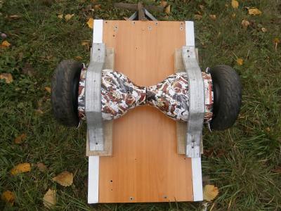 На сей раз колёса вращаются с помощью переменного резистора. На столе, при хх работают отлично. Но при полевых испытаниях с нагрузкой ( масса 70 кг на тачку) колёса не трогаются с места. При увеличении оборотов колёса гудят и вышибает контроллер аккумов. На днях собираюсь подсоединить три аккумулятора от авто и вновь испытать. В паутине подобной конструкции тачки на гироскутере не нашёл. Вопрос стоит, - хватит мощности колёс гироскутера для тачки?