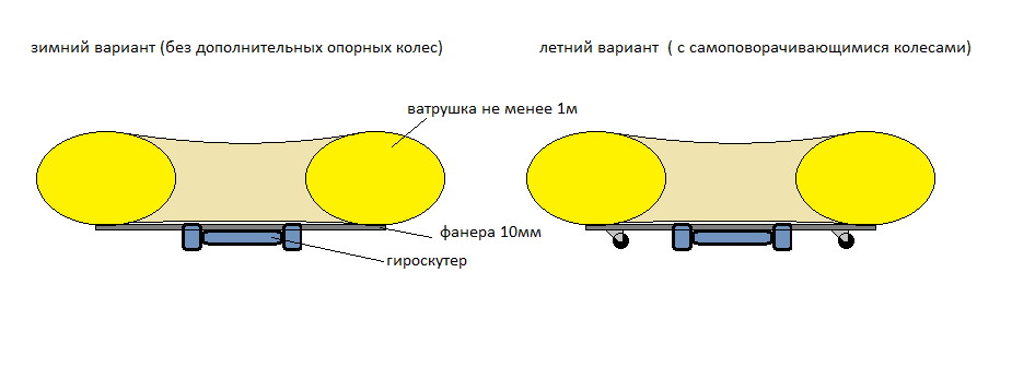 На гироскутер крепится круглый лист фанеры. На фанеру ремешками цепляется ватрушка немного большего диаметра. И в руки ездоку выдается джойстик, типа описанного выше в теме, и выпускается на лед. Дрифт, юз и пробуксовка гарантированны.  Драйв и веселуха!