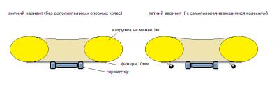 А летом снизу фанеры прикручиваются несколько самоповорачивающихся колесиков.