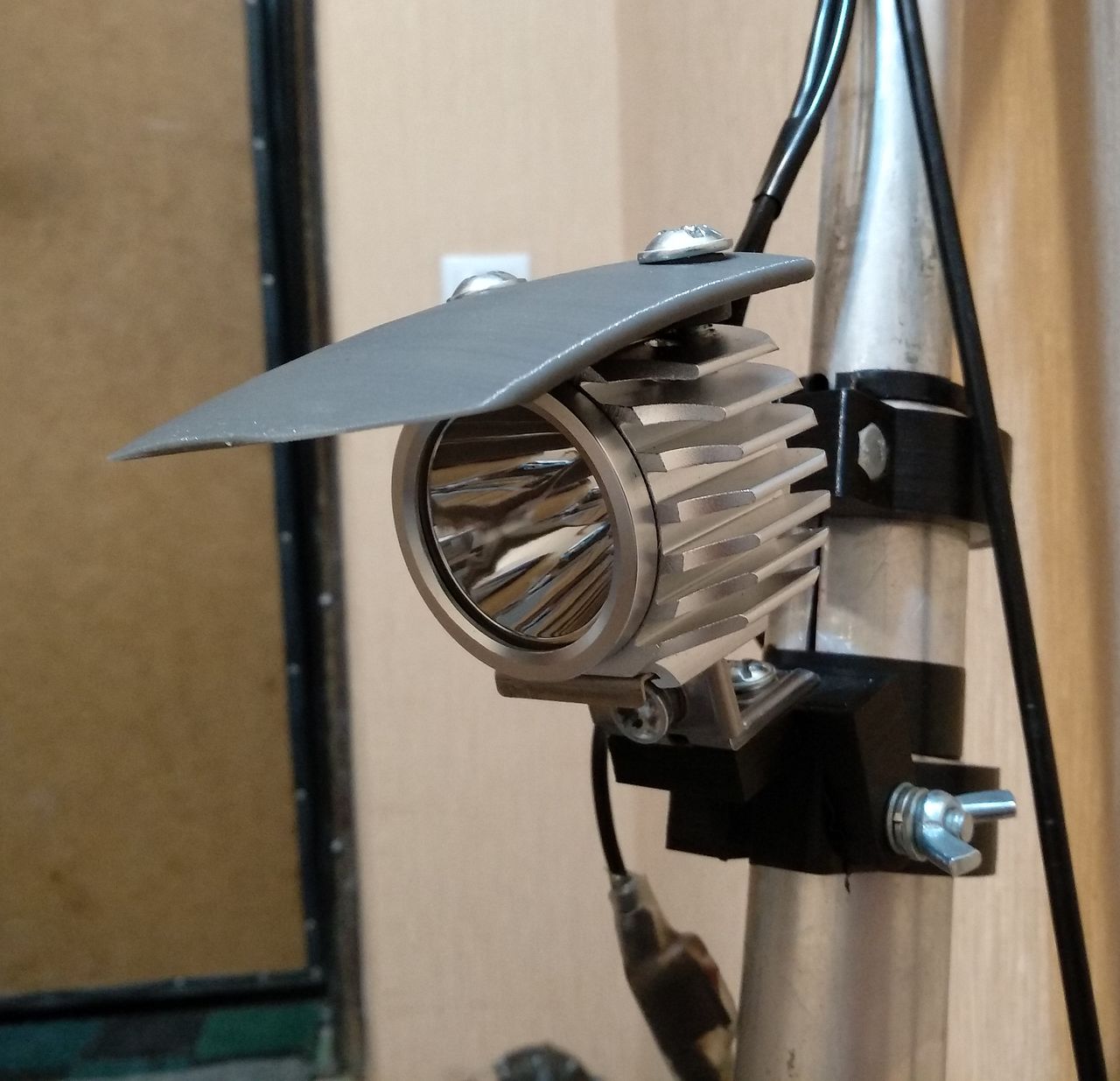 Пока что решил сделать козырек подлиннее и закрепить фару дополнительным ребром жёсткости, чтобы меньше болталась