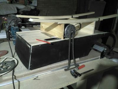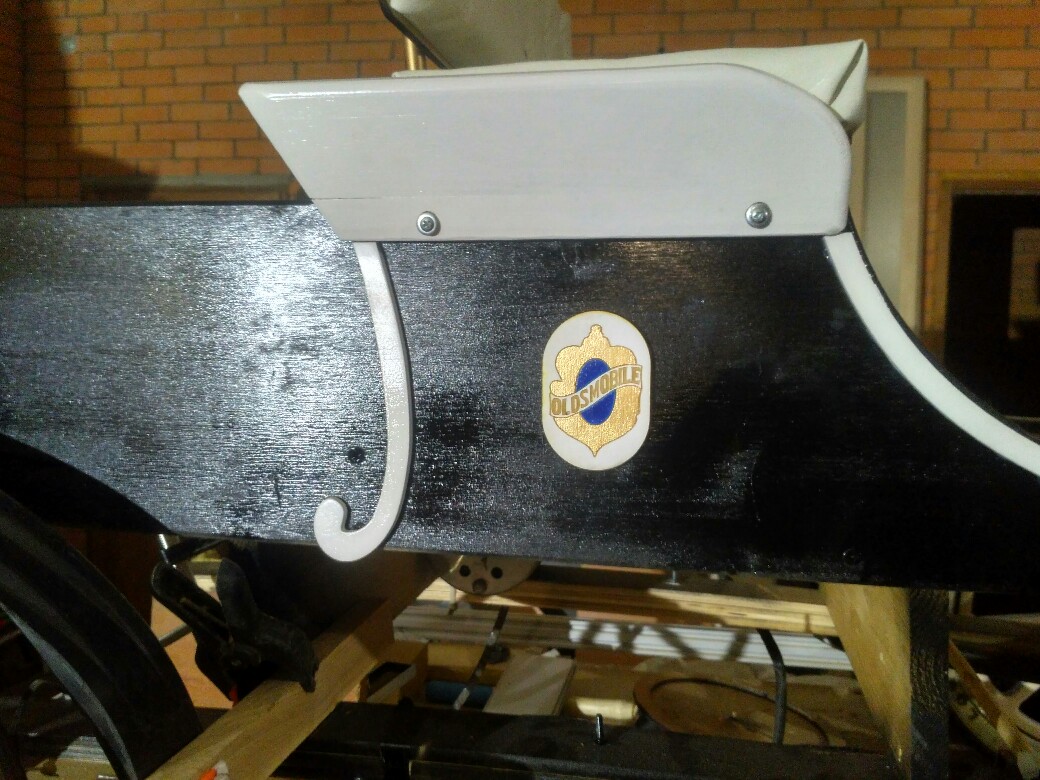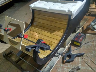 сам кузов вырезан из мебельного щита 18мм, колёса из фанеры 4мм в 4 слоя, потом склейка, потом скруглил кромки ручным фрезером, к ним прикручены корпусные подшипники