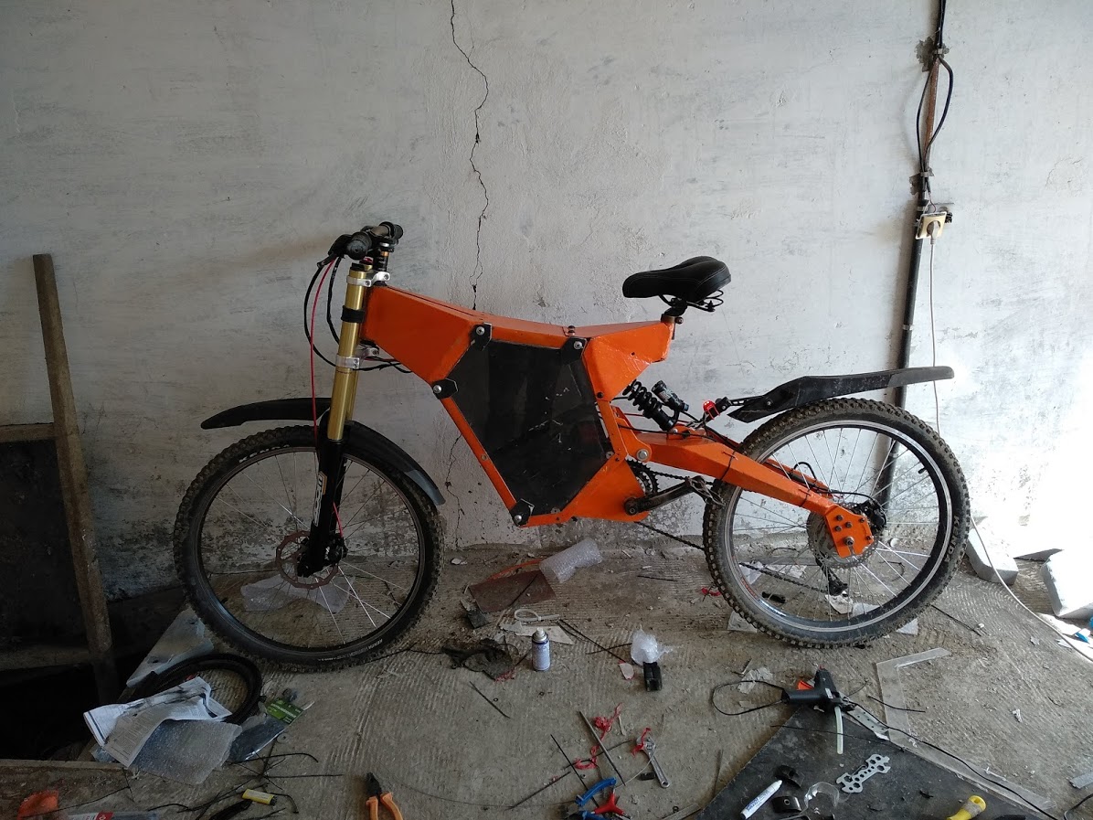 Сделал боковые крышки из орг стекла, пришлось делать крепления ибо стекло лопнуло когда я сверлил в нем дырки под болты, да и педалям мешало крутиться. Из утеплителя вырезал форму под аккум и обмотал армированным скотчем что бы не рассыпался. Засунул контролер в коробку у руля, зафиксировал по центру, на алюминиевую загогулину что была у меня под сидением, на крепления для того же седла, проложил все острые края внутри резиной что бы провода не терлись. Жду вилку передннюю, чета она походу потерялась где то по пути.
