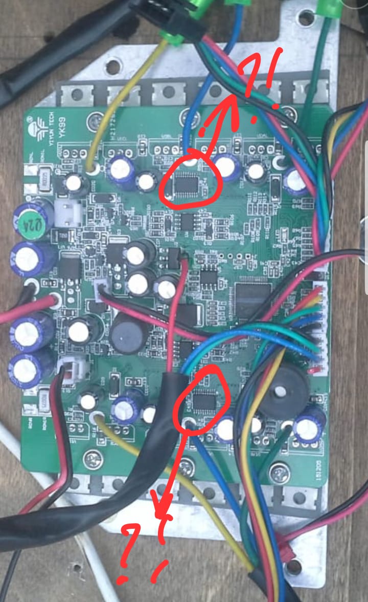 Залилось все хорошо, но при включении даже с отключенными датчиками холла и без разницы в каком состоянии ручка газа. Плата дает шим на некоторые ключи. При этом уходит в защиту как блок так и плата. Подключал только один комплект датчиков холла (поидее вообще не должна плата дергать ключи если датчиков нет) но все равно дергает ключи, игнорируя положение газа. Ну и осцилографом видно что питание пропадает (на 3.3, 5, 12 и силовое) когда открываются ключи,плата перезапускается, все питающие линии выростают до своих номиналов и все по новой. Плата снята с рабочего гироскутера, перед обновлением прошивки включалась с долгого нажатия, потом музыкальное приветсвие. После обновления прошивки стала запускаться с закорачивания выводов кнопки.