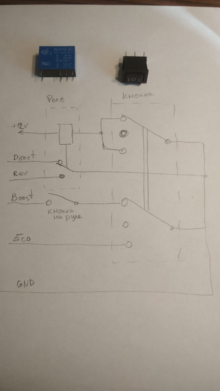 Тогда нижняя кнопка будет три положения direct/reverse/eco ,а верхняя -подключение boost из режима direct