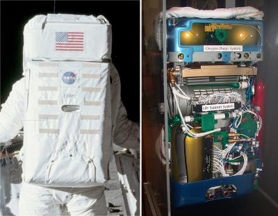 А вот ранец, якобы использовавшийся на Луне. Кто знает, что это там наворочено внутри? Это кондиционер? Но самая главная загадка - а батареи где, Карл? Чтобы несколько часов поддерживать комфортную температуру внутри, нужно нехилое количество энергии. Они что, китайские 18650 использовали с декларированной емкостью 7800мА-ч?  ;-D
