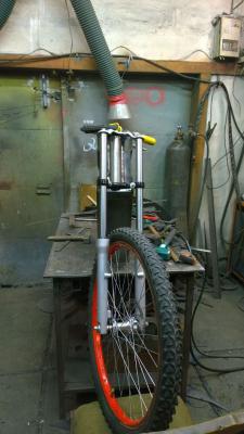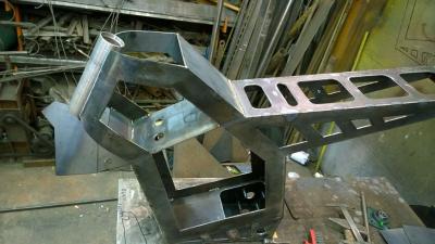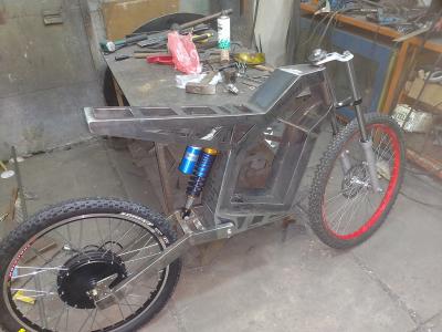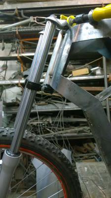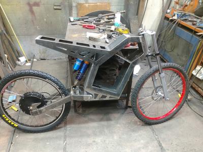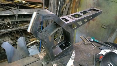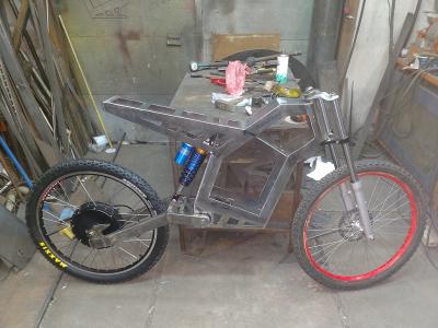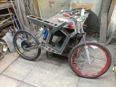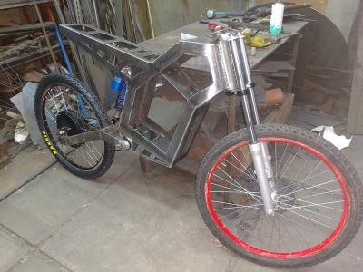 Здравствуйте друзья, долго не писал, решил собрать побольше материала, но на данный момент до выезда осталось 2-3 дня, можно немного написать. Пол месяца назад забрал раму. Делали её долго. Почти 3 месяца. За визуальный образ была взята картинка с силуэтом рамы с Тольяти, на данный момент не вспомню авторов, но кто интересуется узнает знакомые черты. Метал выбрали 3 мм листовая сталь, позже сошлись на том что немного перестарались с толщиной, но переделывать не стали. Запас по прочности лишним не будет. Человек который мне варил раму, Вася, очень сильно помог, маятник полностью его работа, у меня на тот момент не было его чертежей, он создавал его на месте. Все декоративные элементы тоже его задумка. Межосевое расстояние 1280 мм, колеса 26 дюймов, передняя вилка от мопеда "Альфа", 2 амортизатора с подкачкой, от той-же "Альфы", пружины заменены на "Днепровские", так как родные даже два аморта не выдерживают такую нагрузку. Все элементы рамы вырезались в ручную с помощью плазмореза. Сварка Кемпом. Вот несколько фото с работы над ней, полностью  готовый вариант будет позже... вопросы, предложения и критика приветствуются...