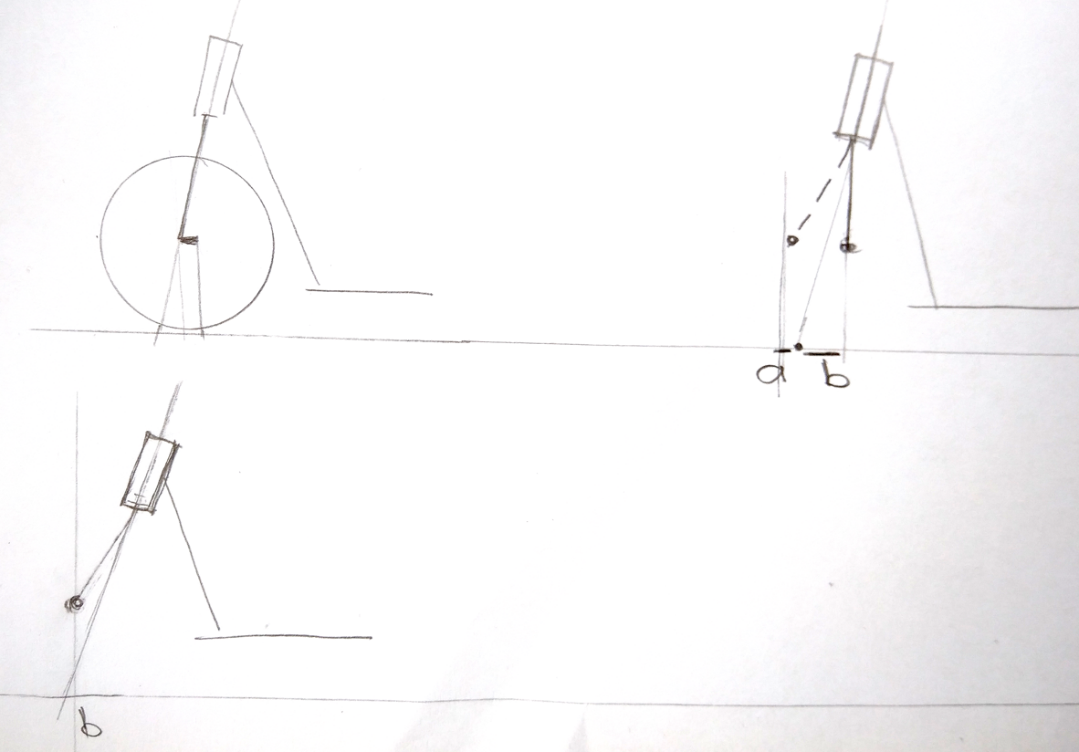 Верхний левый рисунок эквивалентен верхнему правому. Трэйл (b) у меня положительный, всё ок. Но меня всегда смущало понимание что под весом вилка пытается провернуться из явно неустойчивого положения в устойчивое показанное пунктиром. И самое смешное, что если сильней наклонять вилку (увеличивать рэйк), "увеличивая" устойчивость, устойчивость будет только ухудшаться! Вилка всё с большей охотой будет пытаться провернуться в устойчивое положение. Вместе с тем я понимал, что положение пунктиром имеет отрицательный трэйл (а), что чревато проблемами на скорости. Тут я получал "когнитивный диссонанс)))" и решал что всё сделал правильно, нефиг страдать.