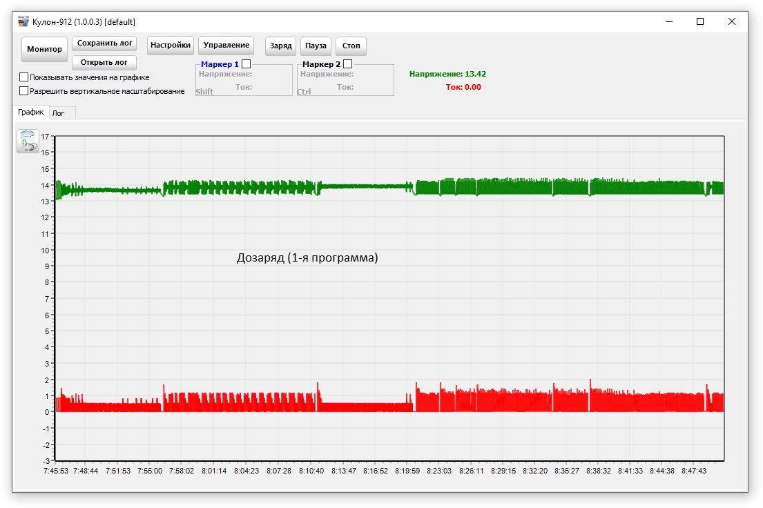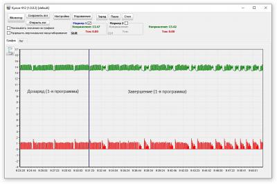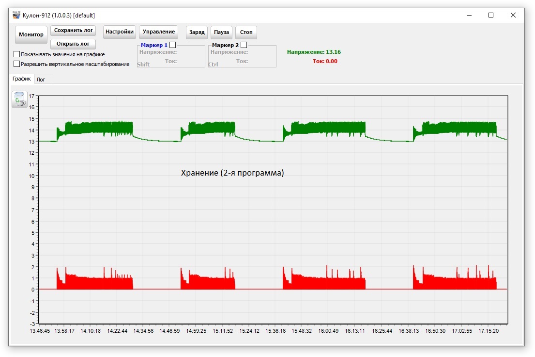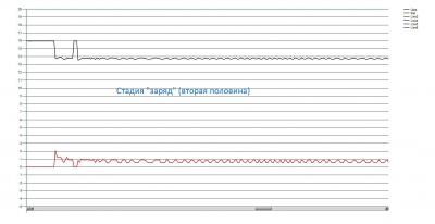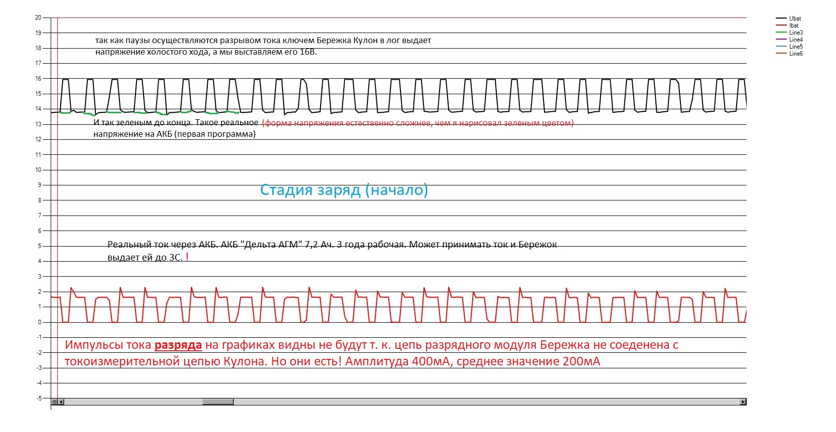 4.Кривая линия "Напряжение" на графиках отрисовывает именно "напряжение на АКБ", а не пики от 16В вниз.