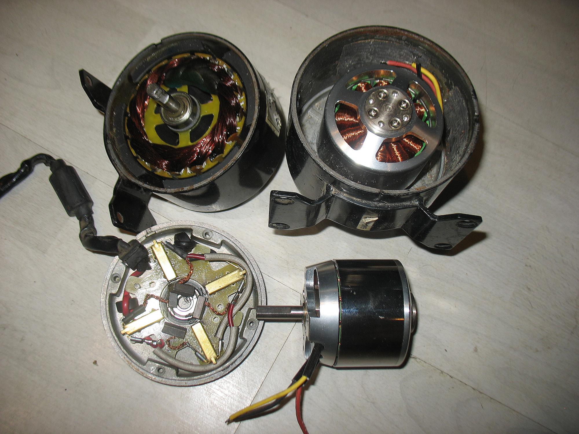 А это двигатель от razor300, 2 картинки слева. Там коллекторник с 4-мя щетками (моментный движок). А справа - это то что я засунул в штатный кожух коллекторного двигателя - bldc мотор...