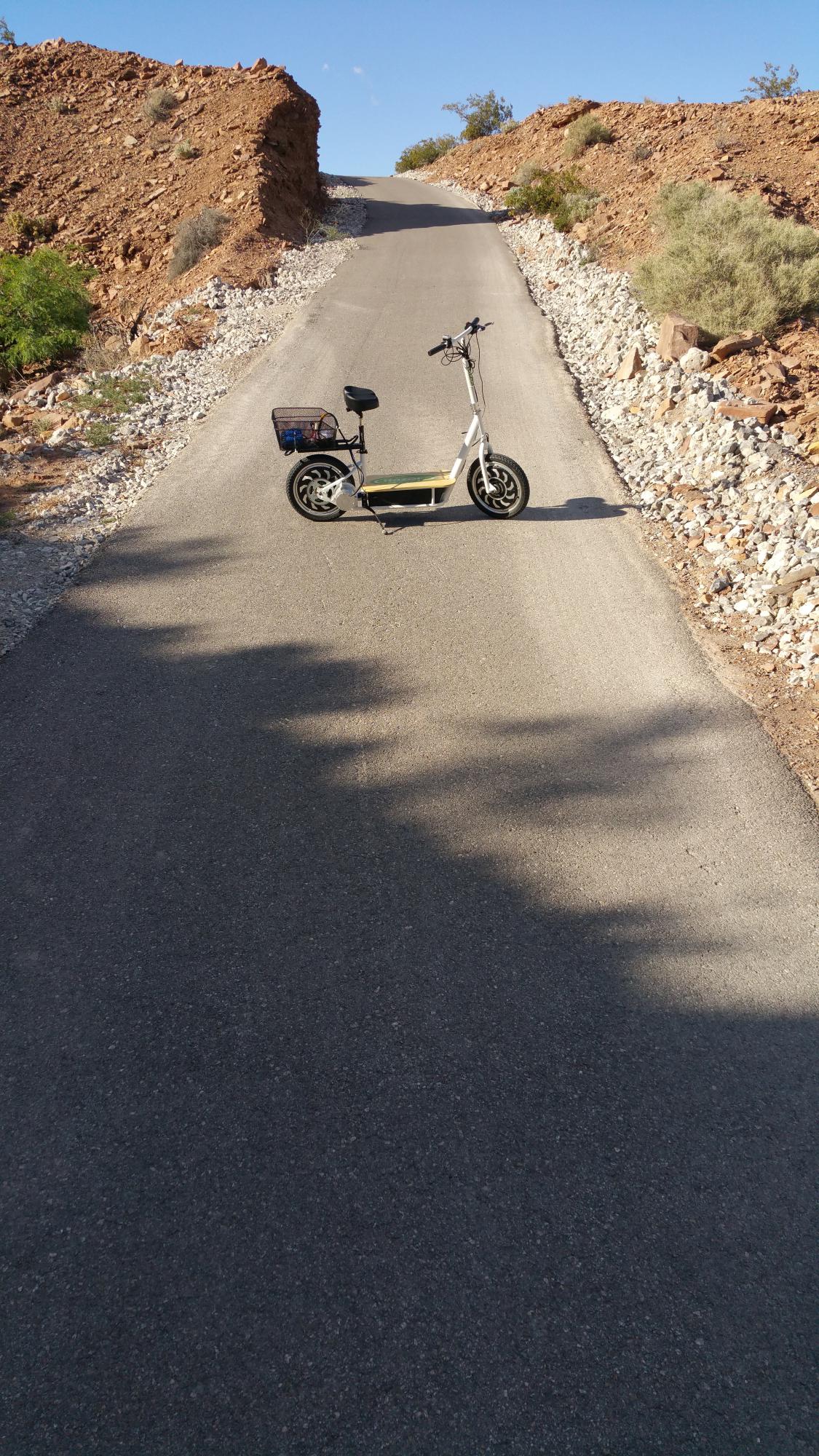 Как было дело? Заменил на Лошаре стоковое седло на безносое (теперь у меня и на Лошарике, и на Лошаре по такому седлу), прилепил две термопары на мотор, чтобы посмотреть, какого порядка там температуры, и решил протестить на мелкощебенкистой (мелкощебенистой? мелкощебенчатой?) грунтовке в пустыне со стабильным уклоном вверх 4-5%. Проехав километр, я остановился для фотосессии: