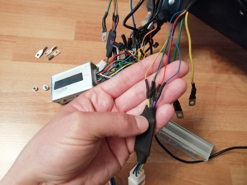 Кучей оголённых контактов лежат в деке подключены только силовые, пара разъёмов с одного контроллера не подключены (не знаю что это и два провода с 1 не подключенного контакта откушены этот контакт завязан на паутину проводов с боковой подсветки и предполагаю передней фары вся эта байда тоже не светится.  Есть какие нибудь предположения по поводу отключения самоката? Нижний порог на экране поставил на 48в. Заметил что замер вотльтажа  отсоеденнёной батареи на 1 выходе показывает 54.9в на втором что-то в районе 10в  и постепенно начинает расти в верх.