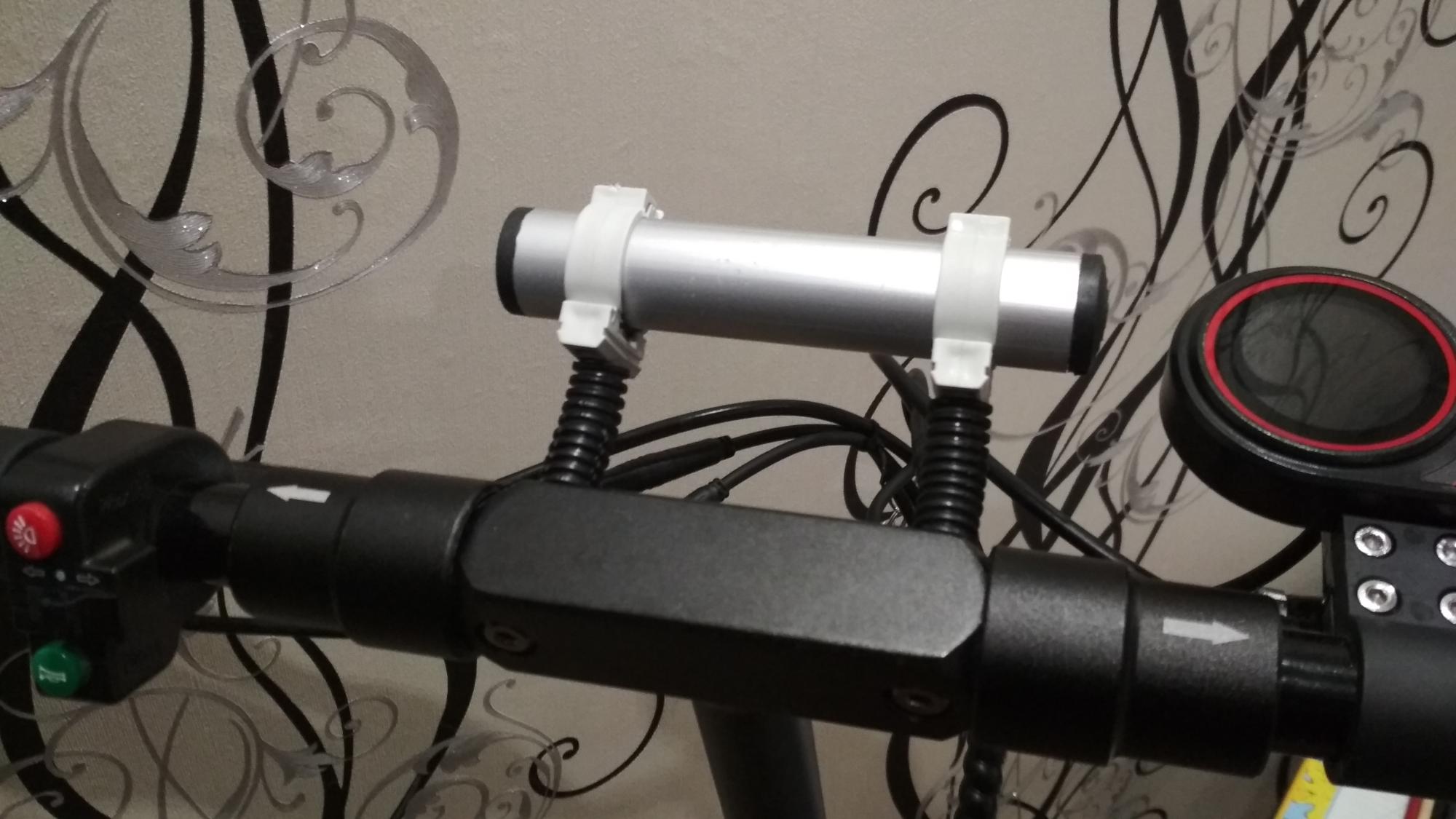Видел у самокатчиков, кто катается сидя, данный девайс закреплен под сиденьем, на трубе.