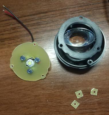 Перенес светодиод практически вплотную к линзе и установил его на стандартную алюминиевую звездочку.