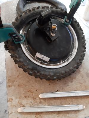 В шиномонтажке решил не позориться, нужна новая камера. Алик предлагает только не совсем наш размер (16 х 2,50) за 700-800руб без учета доставки, но главное - от 20 до 40 рабочих дней. Поехал по мотомагазинам. С моноколесным соском, ес-но, нет, но есть в наличии подходящая мотокамера, на ощупь вдвое толще, чем родная китайщина. Недостаток один, но сильный - сосок гнутый не в оси вращения, а перпендикулярно. Сделал заход в шиномонтажку с новой камерой с просьбой вырезать и развернуть сосок - отказ. Ну что же, монтируем что есть. К третьему шиномонтажу я уже подготовился - прочитал советы бывалых на мотофоруме, запасся годными мотолопатками (550руб х 2шт.) и струбцинами (были).