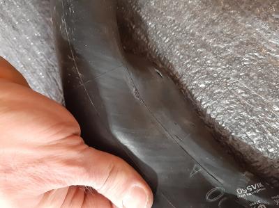 Небольшой отчет о шиномонтаже на 16X. Злую резину пару недель назад успешно поставил, обкатал и успокоился. Поскольку лентяй, давление в покрыхе с момента установки не проверял ни разу, оказалось - зря. Вчера днем еду, колесо ведет себя странновато - пищит тремя писками на относительно небольшом разгоне, пробивается на небольших поребриках, но упрямство и лень сильнее - еду дальше. Начало шатать влево-вправо на ровном асфальте, как будто по песку, все равно еду. Наконец пустая покрыха начала цеплять за арку, тут даже до жирафа дошло посмотреть, в чем дело. Слабая надежда подкачать быстро улетучилась, когда обнаружил втянутый сосок камеры - провернулась, зараза. Вскрытие подручным инструментом (строительная монтажка и ключ от болгарки) привело, кроме исцарапанного диска, к обнаружению изрядно покалеченной камеры.