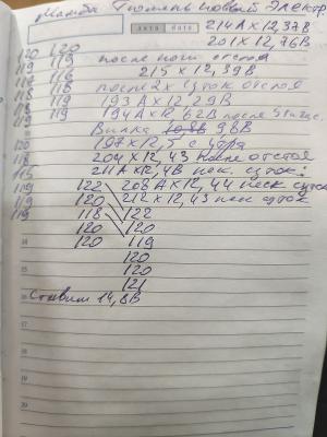 Папа, объëмы я замерял для сравнения разницы между банками. Количество в порах пластин предпологал примерно равное и сильно меньшее чем выкаченное. В чëм проблема? Количество молекул не подсчитывал. А вот сколько и какой плотности долить, рассчитал. После этого сделал ктц, взял плотности сразу после разряда, напряжения по банкам при 10.5в, даже уровни отметил на просвет. После заряда проделал аналогичное. Результатом был очень доволен, всë стало гораздо ровнее. Помнится, ты мне даже давал табличку с необходимым количеством эл-та на Ач для проверки и сравнения. Мои полученные данные были на нижнем пределе помнится.