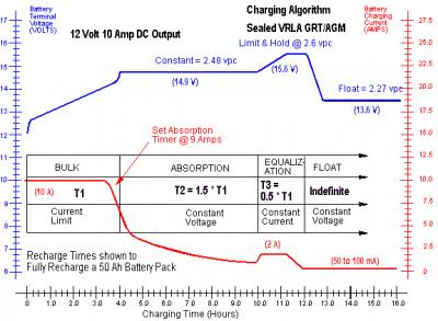 Видно же на графике, что 50Ачковая АКБ при основном заряде (bulk) с током заряда 10А и насыщении(absorption) возьмёт гораздо больше 50Ач за 10 часов, ток при этом снизится до минимума (на диаграмме менее 1А).