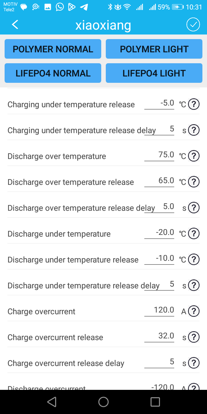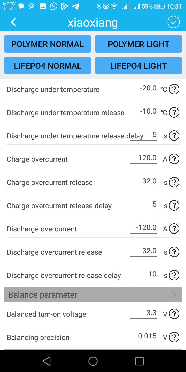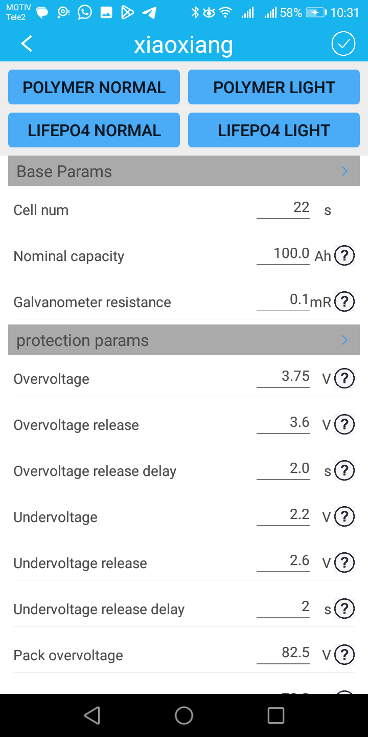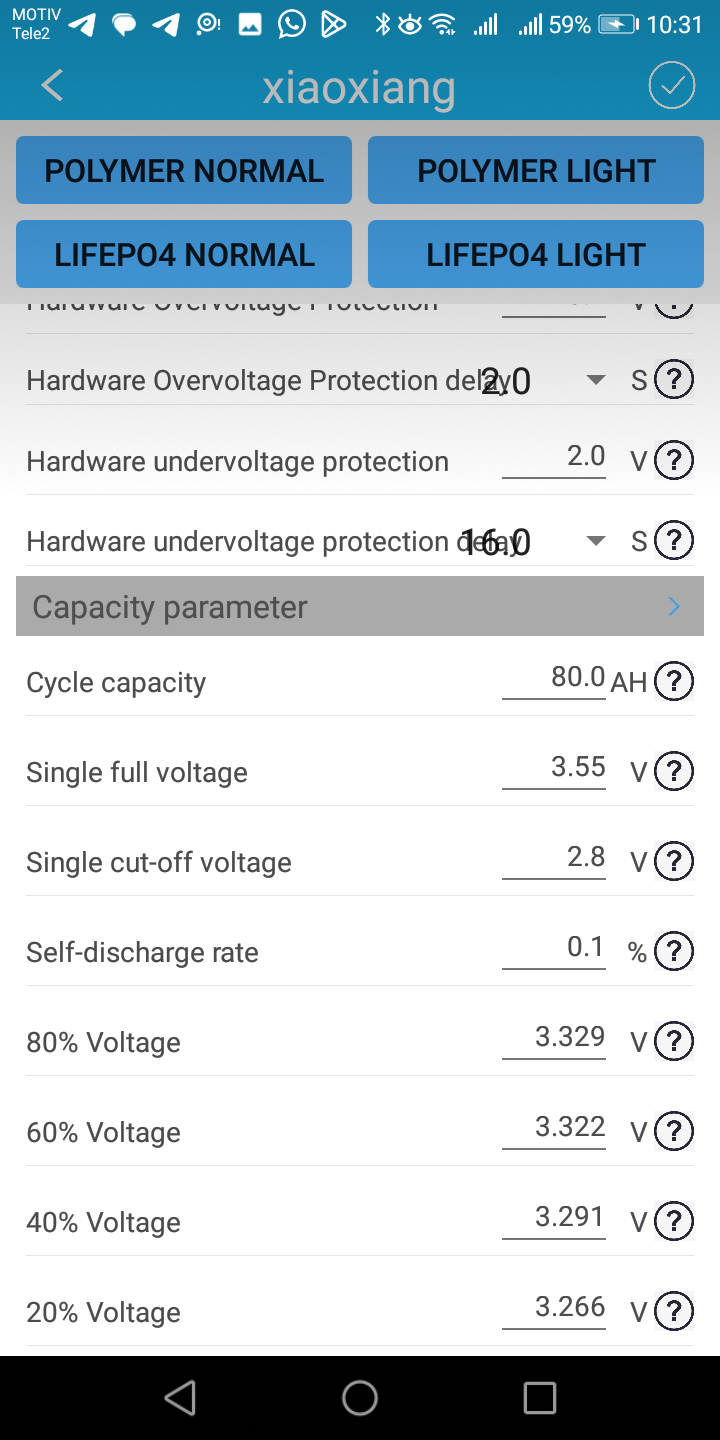 Возможно и допускаю, нужно самостоятельно ввести какие то настройки, но в аглицком языке я ни бум-бум, а в приложении есть кнопочка лифер, аж даже две кнопочки, вроде как лифер легкий. Кнопочки эти значения немного меняют, но заряд все равно не идет выше 73V