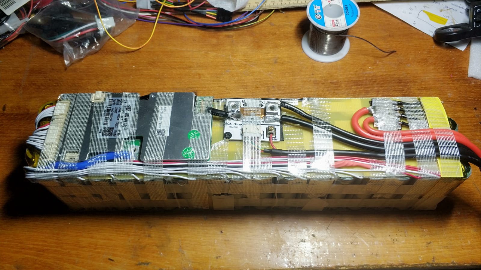 Ну а мне закончили сборку нового аккумулятора 16s4p, 60в 20Ач, смартбмс, кулометр. Он будет работать с передним мотором 350-500вт вкупе с основным, который находится в треугольнике рамы 16s5p.