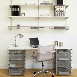Это решение в принципе неплохо для снимающих жилье или арендующих помещение - пару-тройку шурупов под потолком практически всегда вкрутить можно, а дальше что хотите. При переезде конструкция легко снимается, разбирается, увозится с собой, собирается на новом месте. Можно брать железки, а полки-ящики-коробки-рейки сделать самостоятельно.