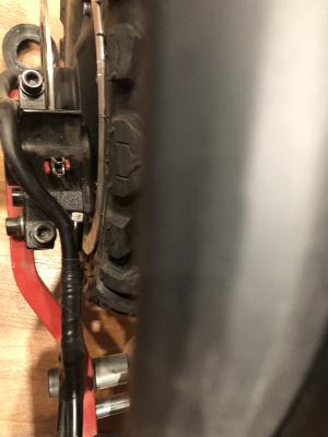 Обратите внимание!!! Силовой кабель идущий на заднее МК скреплён с тормозной магистральной хомутов, у меня это сделано в районе крыла. Магистраль относительно жесткая, силовой кабель тоже, но сегодня на жаре он возможно стал более эластичный, в результате стал тереться о заднюю покрышку, когда я заметил был уже видно синий провод. Площадь повреждения изоляции кабеля примерна 3 -5 мл, повреждение изолировал изолентой, и ей же скрепил силовой кабель и магистраль уже в районе тормозов. К сожалению не могу сообразить как прикрепить фото с iPhone.