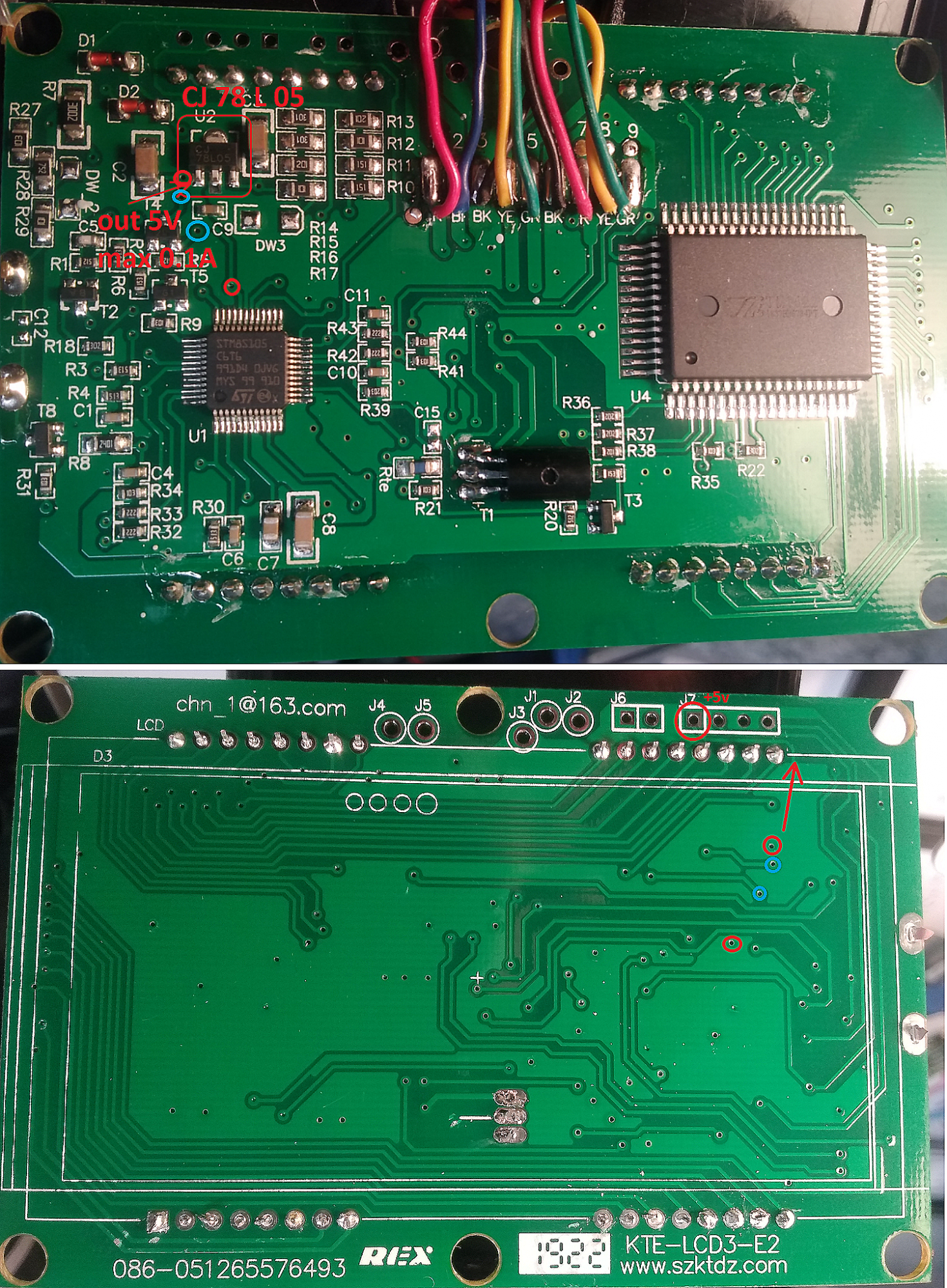 UPD: Нашел стабилизатор CJ 78 L 05 - от него идет дорожка до J7 - думаю то, что надо! Возможно тут должен был быть коннектор для подключения внешнего USB - видел такие экранчики с гнездом https://www.aliexpress.com/item/4000321763567.html