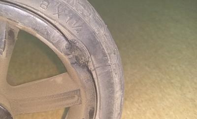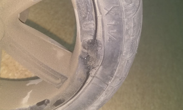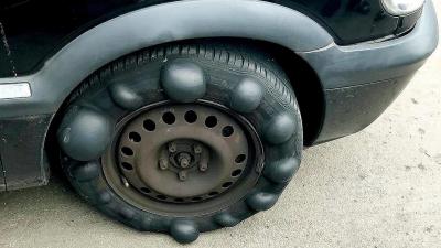 А вот как выглядит задутое колесо от строительной техники - обратите внимание на разрушенную покрышку. Ну и тест на жесткость (пальцем)