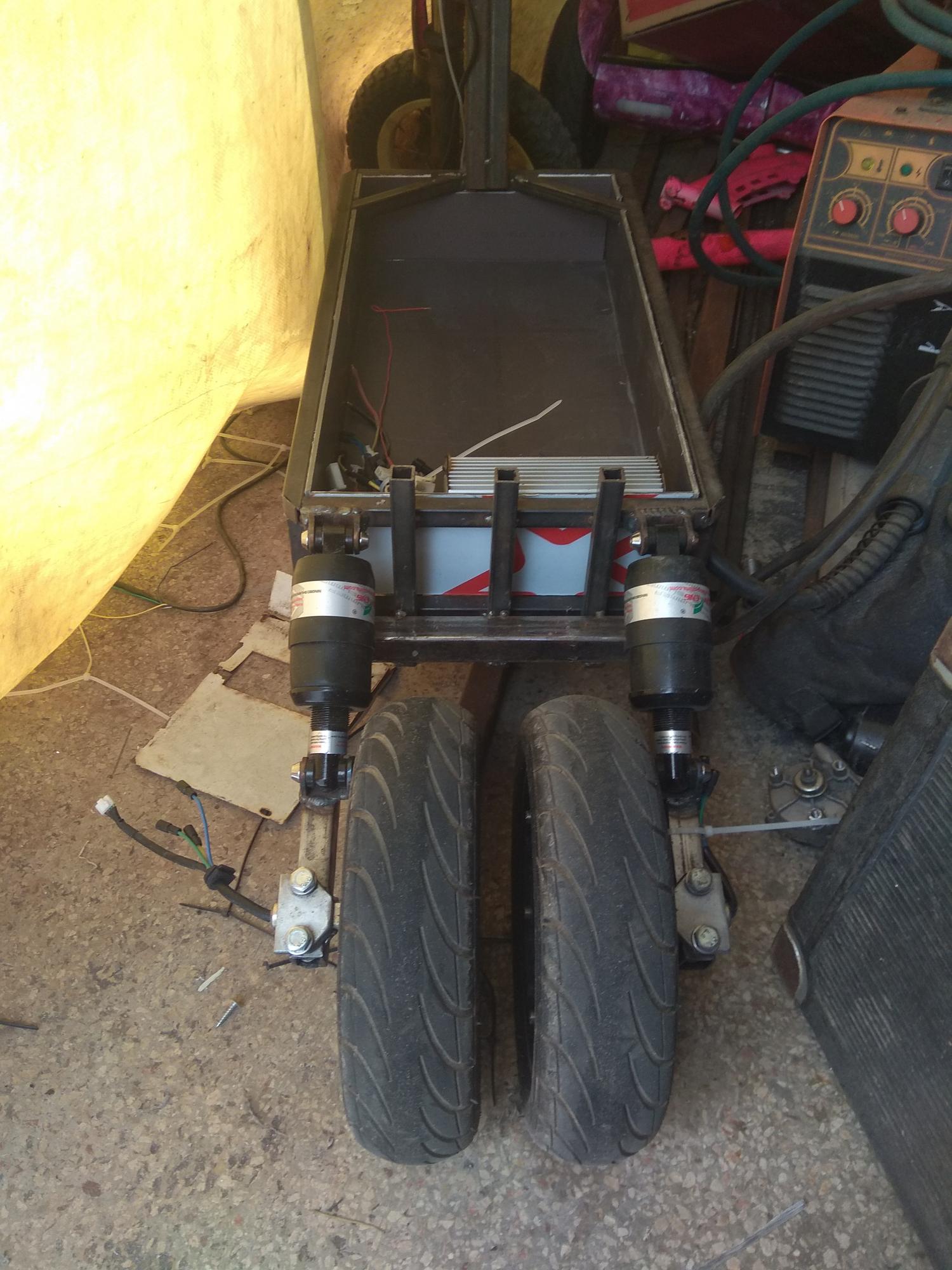 Подвеска  задняя раздельная. Труба к рулевому стакану 20*40 +20*40, две сварены вместе,  посчитал так будет крепче. Нащет колес, в разнесенном варианте в поворот трудно было входить,  выкидывало,  приходилось сильно отклоняться в сторону противоположную повороту (как бы противовес). Был вариант либо больше разнести,  либо свести,  выбрал второе,  не прогадал.