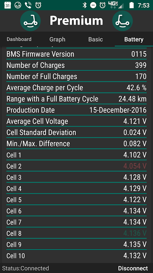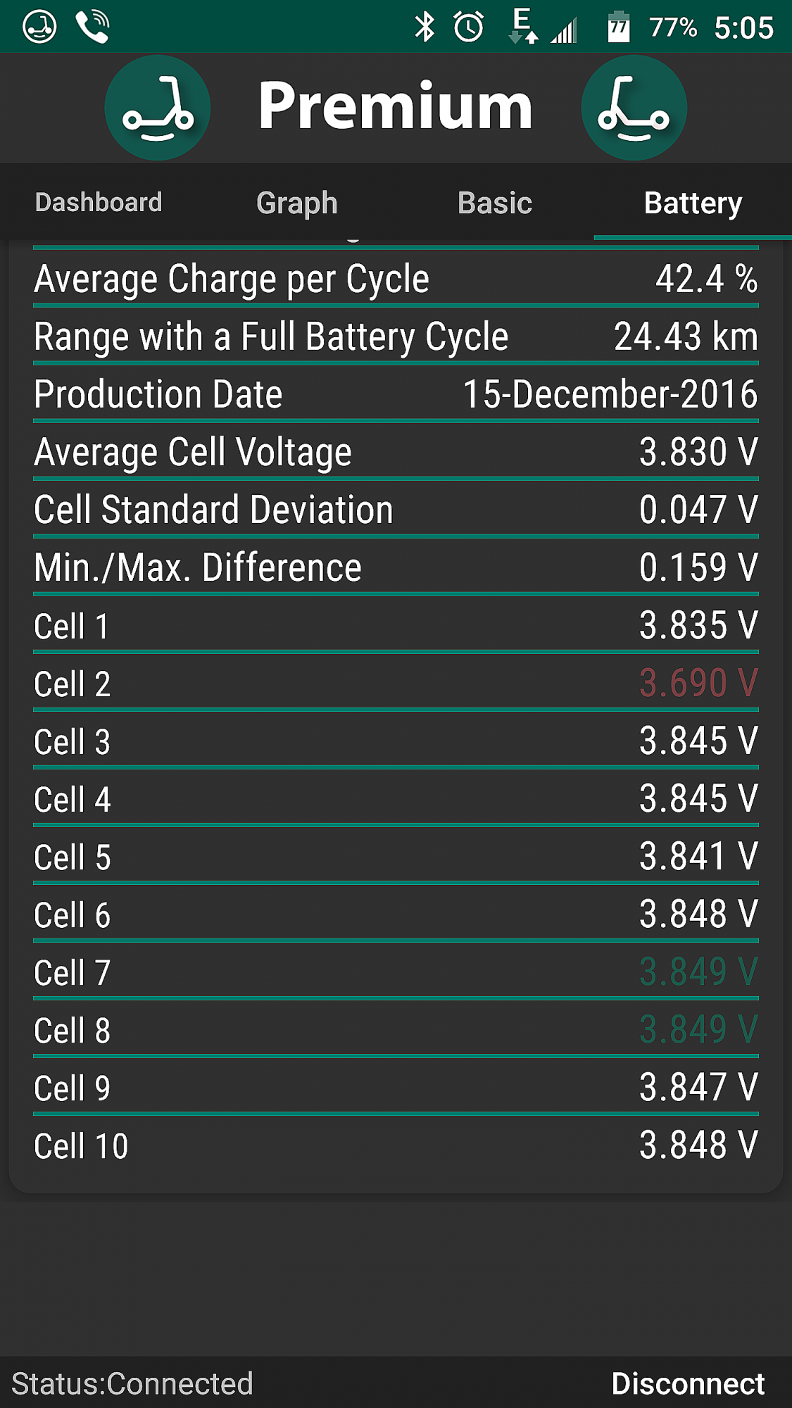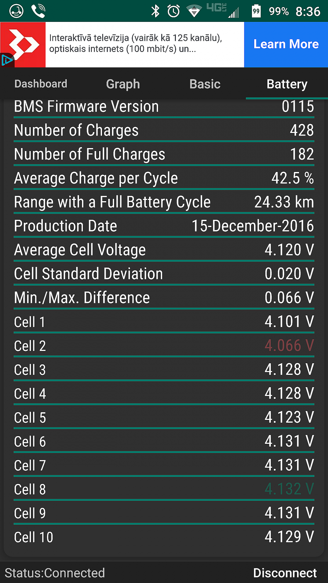Вчера посмотрел на состояние батареи во время езды ~ 60% заряда. Больше чем 0,15 вольт разница