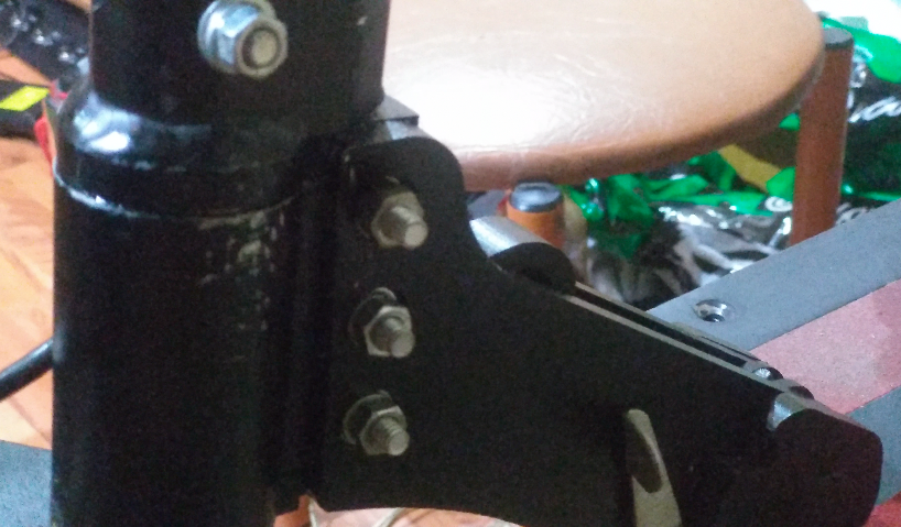 Стянул перья маятника длинным винтом в месте где крепятся амортизаторы, дабы не порвать сварку, хоть там и есть ребра жесткости в виде ввареных уголков, но я решил не рисковать, да и чтоб гнулось по середине пера, после амортизаторов, чтоб их не перекосило и не растопырило - начал играть в арм-рестлинг с маятником ( можно упереться ногой, но в принципе и так получится)
