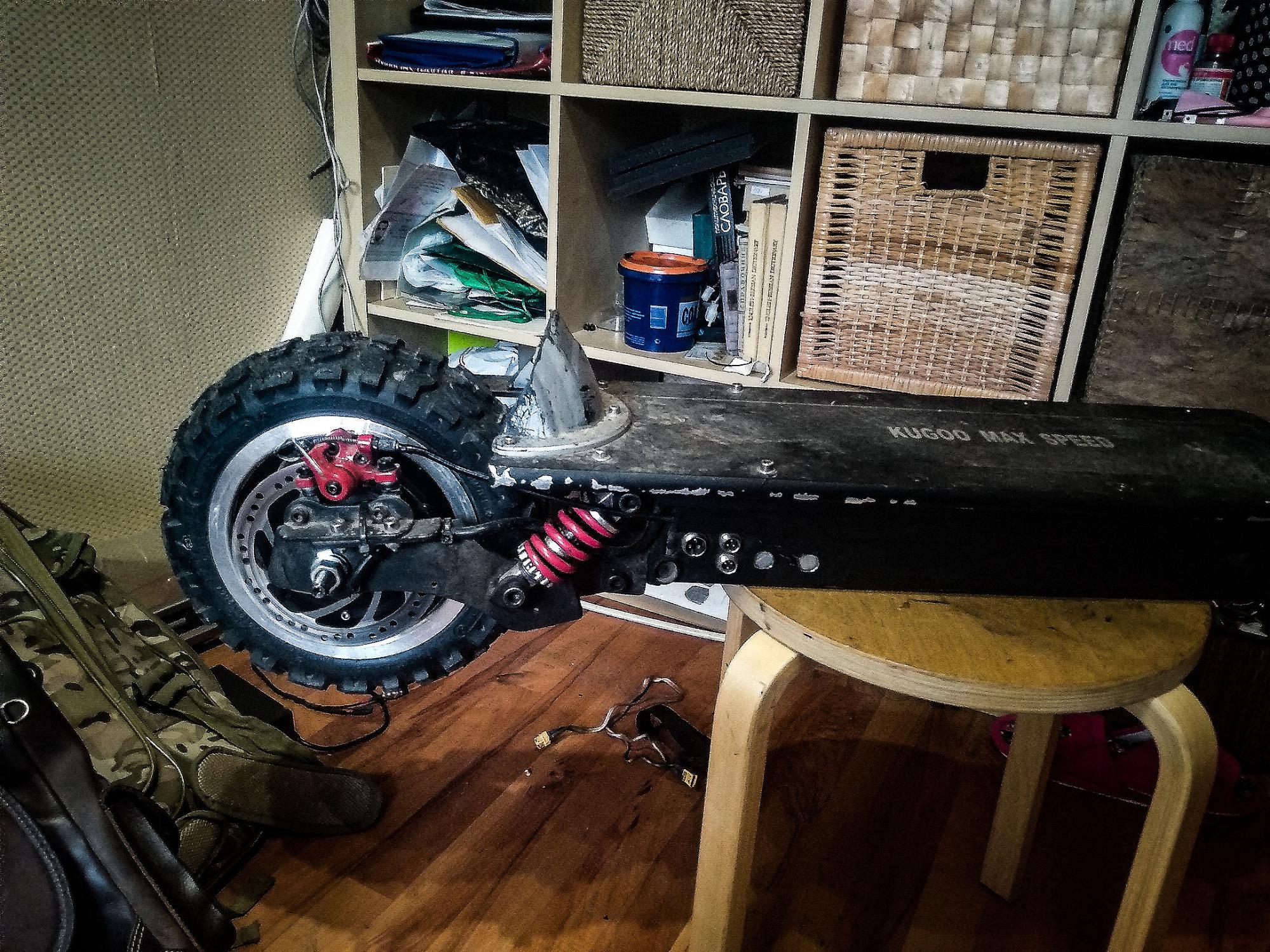 Правда крыло пришлось снять ибо оно чиркало об протектор, а точнее отпилить и оставить его часть для временного упора ноги и ограничителя "наступания", вдруг пятку зажует между колесом и самокатом)))