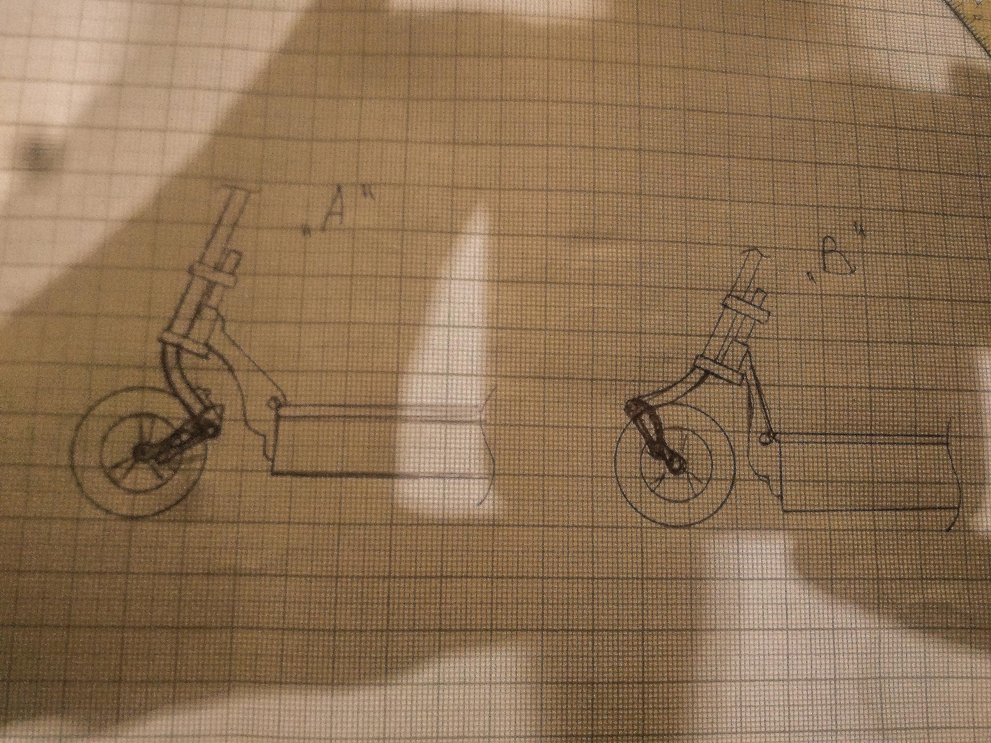 По началу была идея согнуть с помощью трубогиба штаны вилки назад (рис "А") или вперед (рис "В") что кстати дает больше управляемости