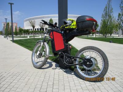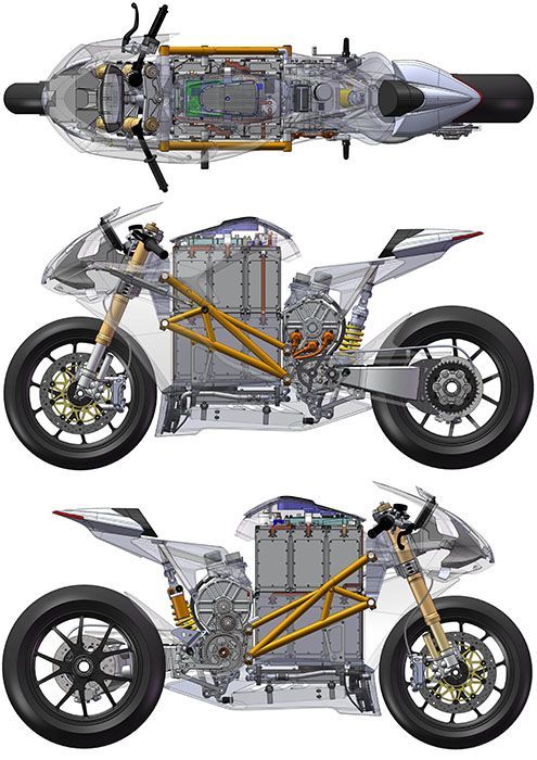 ЦитироватьМотор Sur-Ron мощностью 3000 Вт, поставляемый компанией Luna Cycle, производящей электронные велосипеды. Он подключен к аккумуляторной батарее Panasonic на 65 вольт и управляется синусным контроллером. Жгут проводов изготовлен на заказ и использует детали Luna Cycle, а системы редуктора и главной передачи имеют ременной привод.
