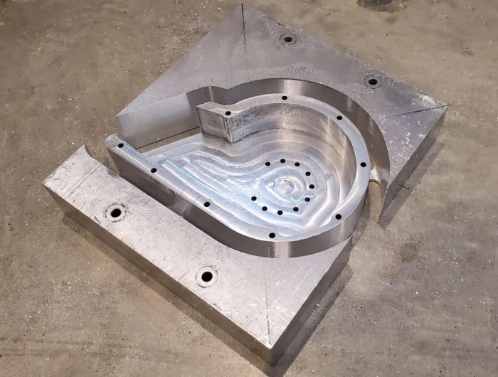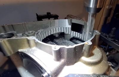 Здесь цельный кусок алюминиевой заготовки вырезается на стане с ЧПУ в форме индивидуальной левой крышки двигателя.