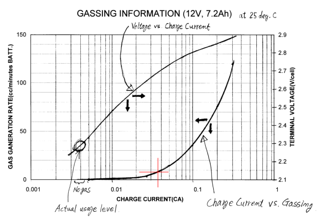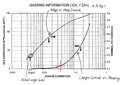 Поискал в своих закладках инормацию по поводу объёма выделяемых газов с акб, нашёл только закладку на статью с графиком по заряду акб agm Panasonic LC-127R2P 12 В / 7,2 Ач.