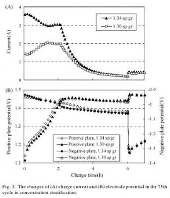 1. Разговор о том, что объяснение - шиворот-навыворот: по графикам видно, что (при наличии расслоения) в нижней части ячейки и плотность электролита выше и ток при заряде тоже выше, хотя электролиз воды там будет слабее.