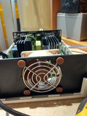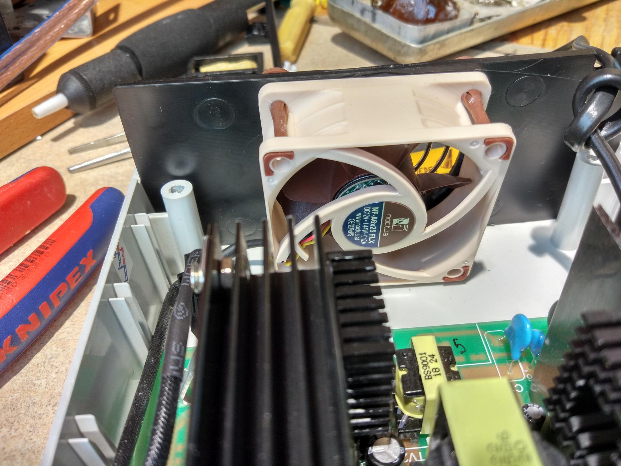 Хоть и поменял карлсона на Evercool EC6020L12S (подробности на 10 странице этой темы), результат не такой как ожидалось, шумит гад.  Брал у друга батарею для КТЦ, жена сказала что выкинет нафиг все эти зарядки)) Реально шумит, занижать обороты тоже не панацея, поток существенно уменьшиться. Плюнул, задушил жабу и купил Noctua NF-A6 NF-A6x25 FLX, дорогой гаденыш, обошелся 920 рублей.  Установил на идущие в комплекте силиконовые "болты", по сравнению с тем что было вообще небо и земля, надо было сразу Noctua ставить) Пришлось полностью отодвинуть панель с вентилятором в конец корпуса так как вентилятор глубокий 25 мм и задевает корпусом за плату. Первое время прислушивался, работает или нет вентилятор, сейчас уже привык. Фото того что получилось в итоге: