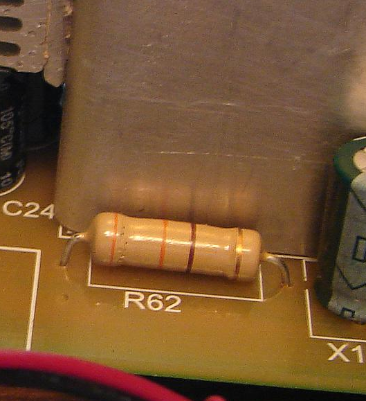 Резистор R62 двухваттный, номинал прочтите по цветовой маркировке или измерьте тестером, как и напряжение на нем - а далее по формуле. Физику проходили?