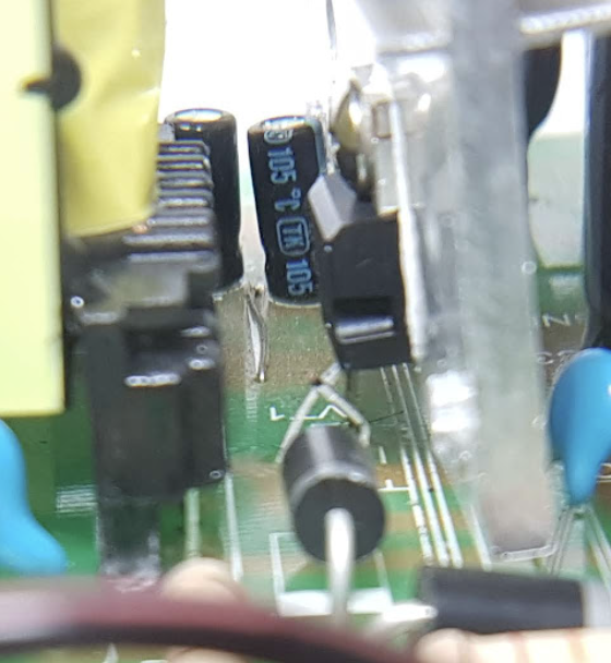 У VT1 обломалась крайняя правая ножка. Торчит по неестественным углом. Возможно из-за нежесткого крепления радиатора (раньше был заменен, держался только на транзисторе).