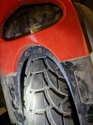 -брызговик из тпу, крепление на резьбовых втулках. минималистичный дизайн, помогвает макисмум при медленной езде по лужам, но зато не забивается ветками