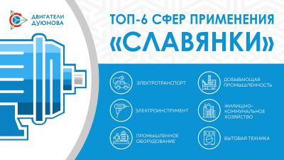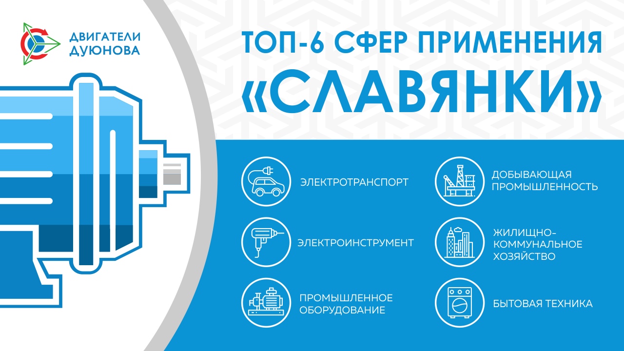 Эффективность «Славянки» подтверждена десятками патентов и проверена годами работы сотни обмотчиков, ежедневно использующих технологию Дуюнова при ремонте электродвигателей. Спектр применения двигателей с совмещенными обмотками охватывает весь глобальный рынок асинхронных электромоторов, затрагивая жизненно важные для человечества отрасли.