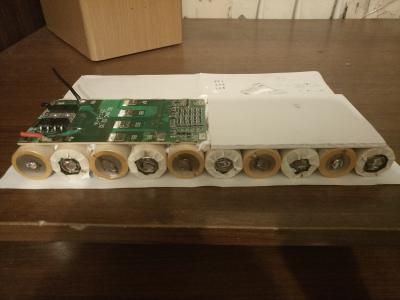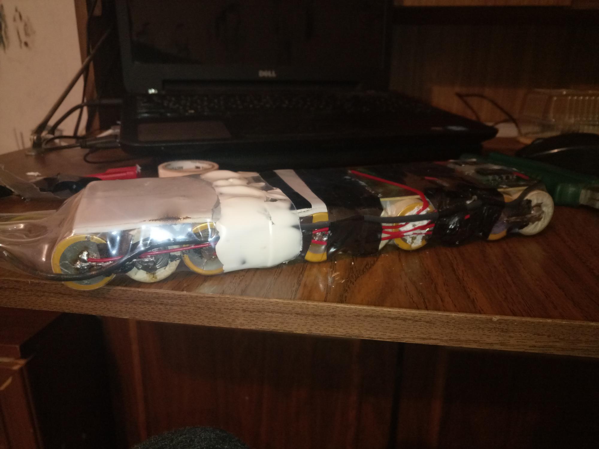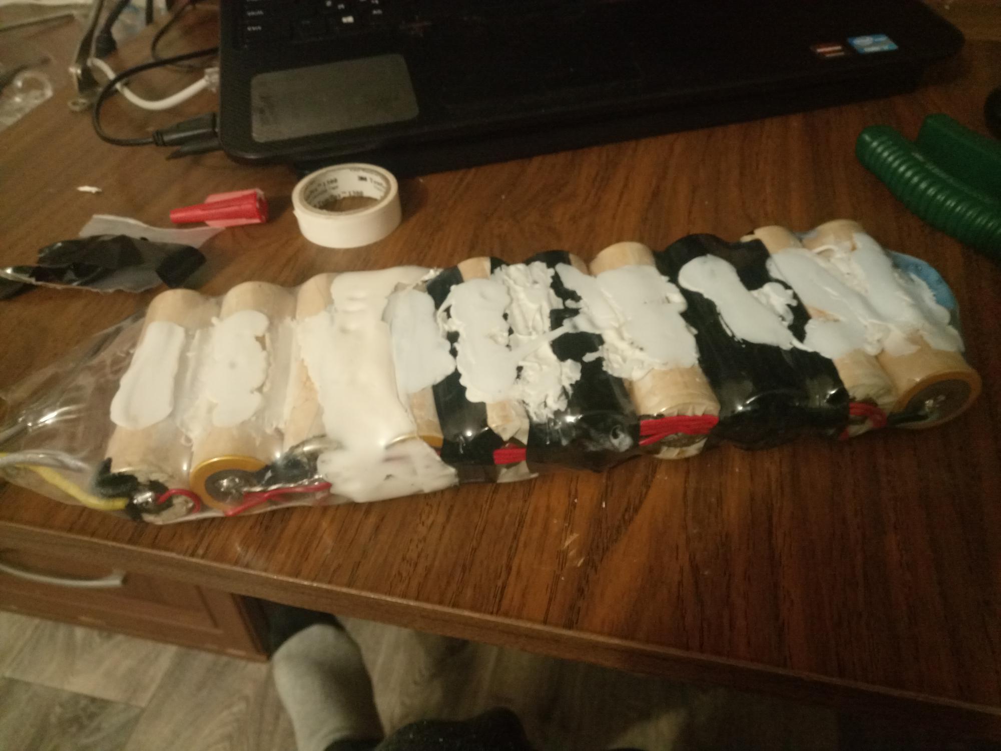 вобщем я засунул батарею, столкнулся с трудностью закрепить переднюю часть, пытался вытащить, никак, если только совсем снимать деку и насквозь толкать палкой какой-нибудь (не готов что-то я на такой подвиг), короче то место где ключи от БМС в распор встало, остальная батарея с зазором... как раз в том месте где не могу приклеить нормально.... корче кое-как закрепил до куда дотянулся, почесал репу, решил забить и все собрал. подключение оставил на завтра. Думаю рискнуть была не была, елозить точно она не будет..... но прыгать и вибрировать передняя часть вполне себе может... ПОлучается банки лежат прм на алюминии через бутылку и часть батареи не приклеена к нему.... кто может сказать как вообще батареи в деках живут? как вибрации переживают эти банки? хотя я там конечно силикона намазал еще между бутылкой банками но слой тоненький...... вобщем не знаю или все разбирать вынимать и БМС вытаскивать и делать пенки или может так оставить можно?