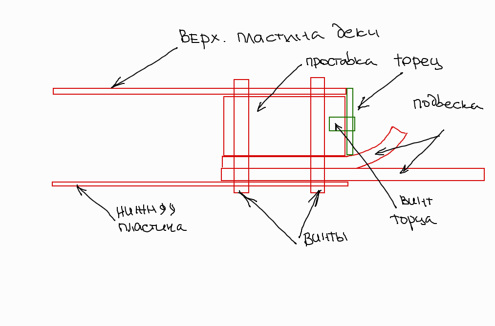 Цитата: _Os от 17 Апр. 2020 в 02:15можно например так. Стянуть верхнюю и нижнюю часть деки сквозными винтами через проставку прижимающую рессоры подвески. Проставка может быть деревянной например
