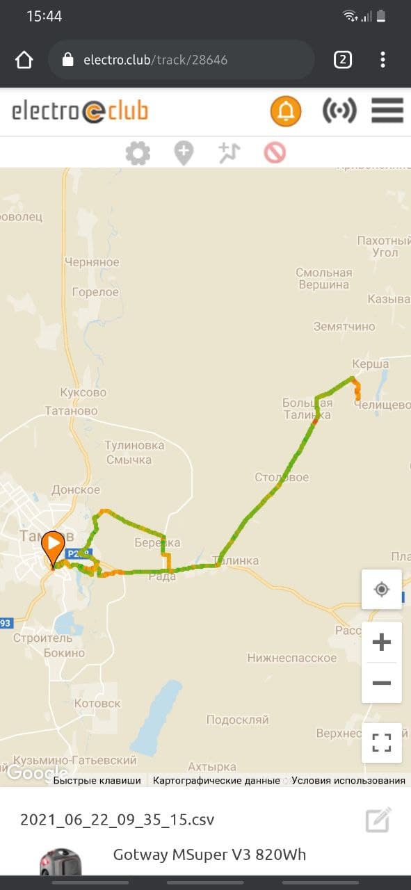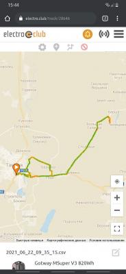 Трек скоростей. Зеленое - более 25км/ч, оранж 15-25, красное - все остальное.