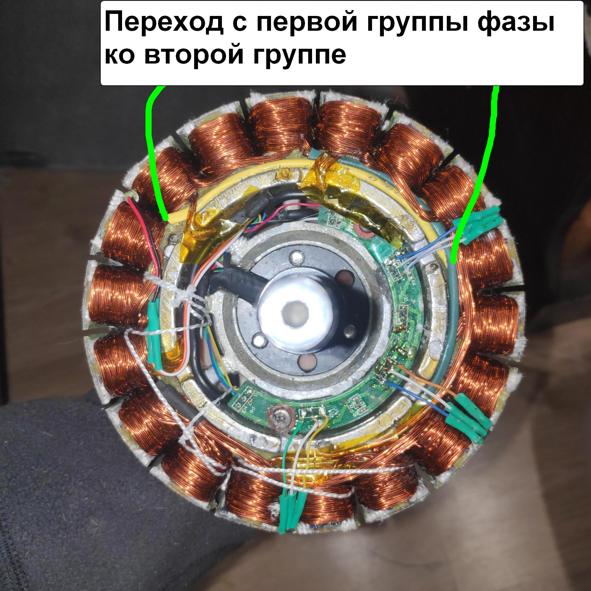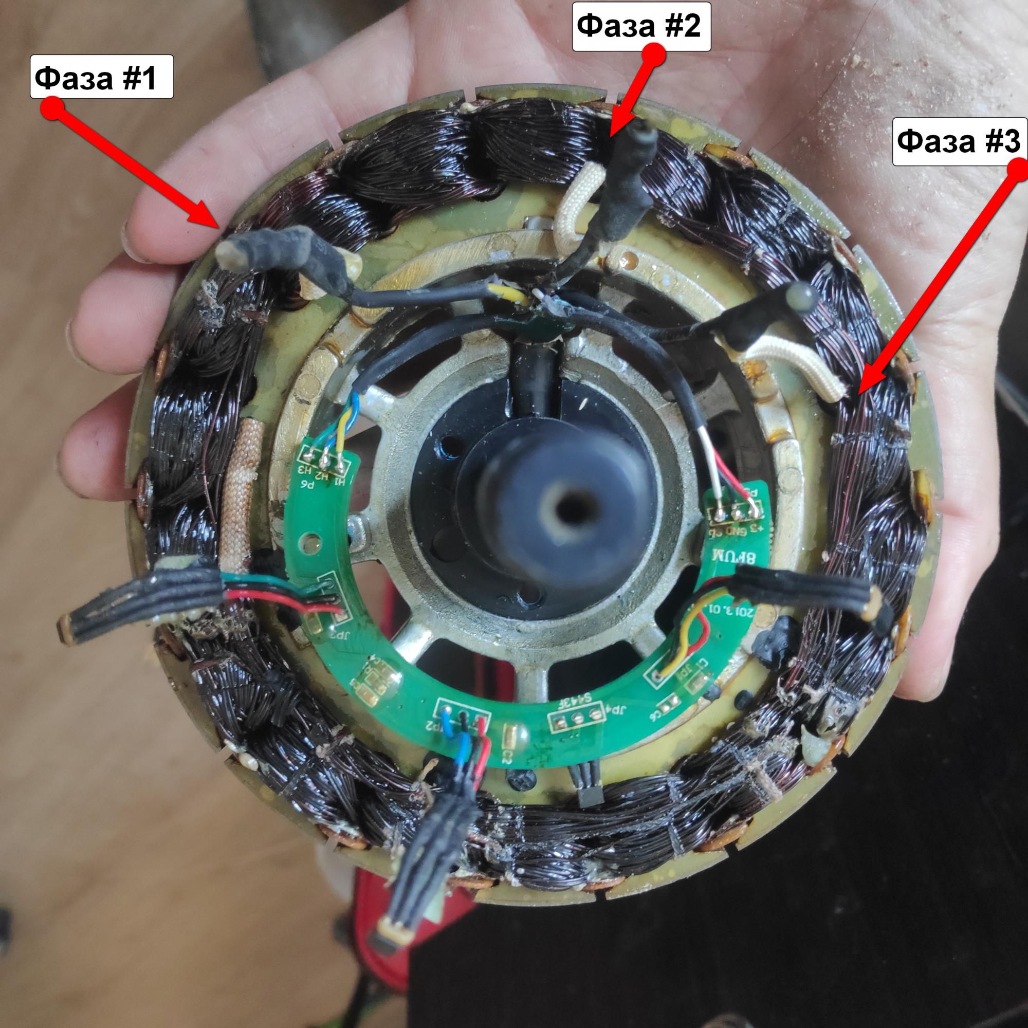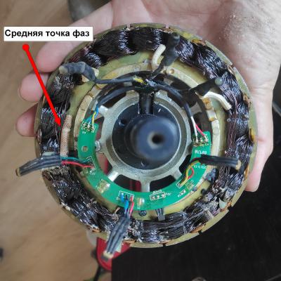 5. Общий план статора где чётко виден ввод фазных проводов относительно датчиков холла