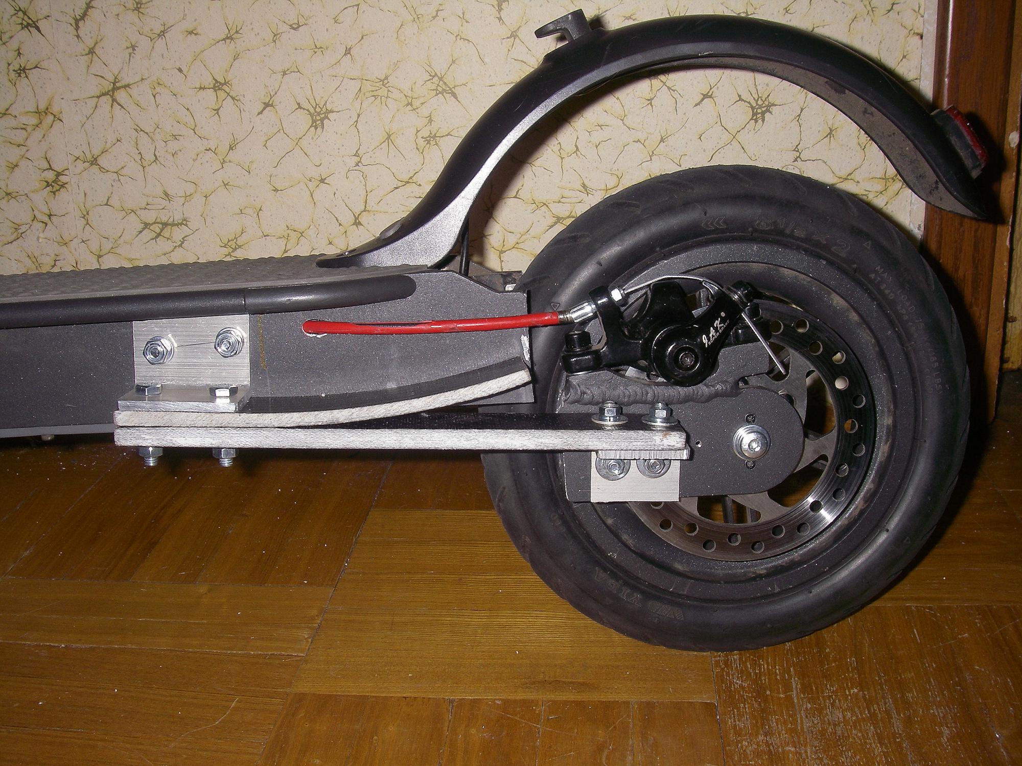 Действительно задняя часть смотрится не очень и, как говорит жена, нужно забираться на самокат по трапу. Ход подвески по оси маятника 90 мм, чтоб уменьшить ход хотя бы наполовину, нужно просто уменьшить ход