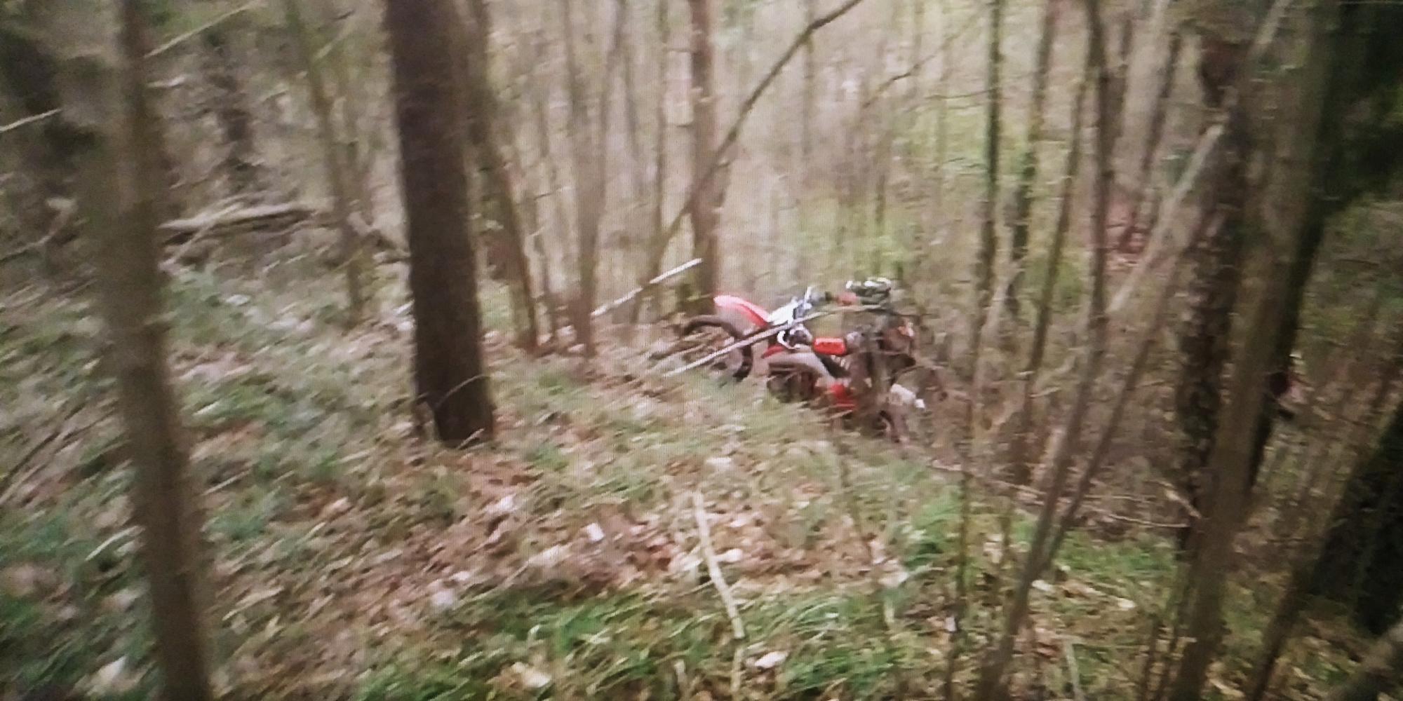 Несколько раз падал на склоне при проходе бревен. Под замену защита руля и перьев. Правой стороной здорово прилетел в дерево.