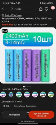 В общем хватит экспериментов с готовыми батарейками, заказал на Али 40 банок  EAIEP ICR18650 26F 2600 мАч, со скидкой получилось 5 015,96 ₽, судя по отзыву от 02.2023 банки неплохие, посмотрим что пришлют.